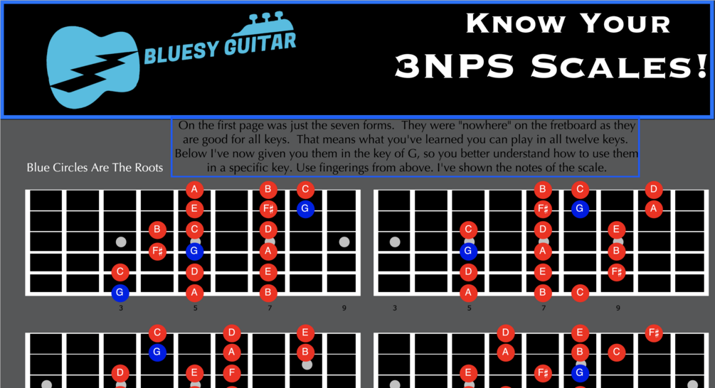 You will first learn the seven moveable forms for major and then get them in a specific key. This way you will understand how to use them right away. As you learn them in the key of G major you will see on the fretboard that the notes are given. This becomes more specific than just seeing them a fingering's.